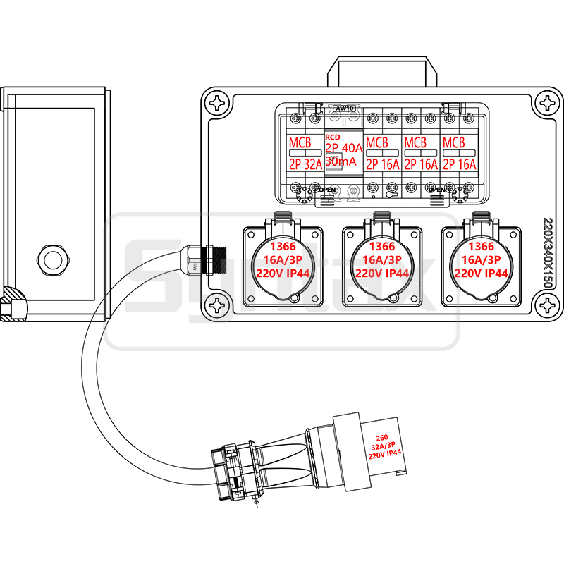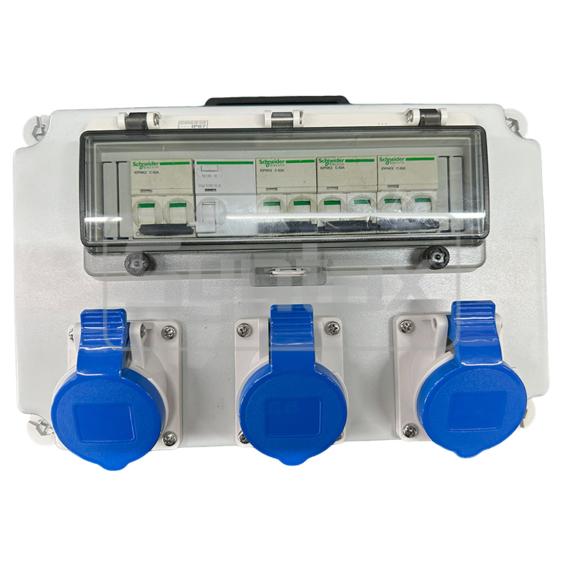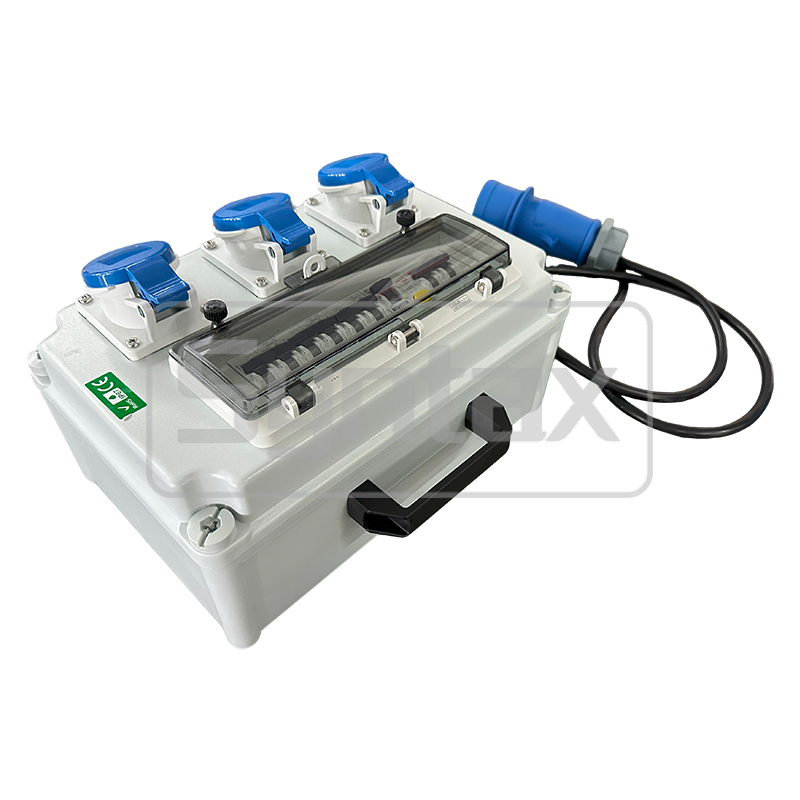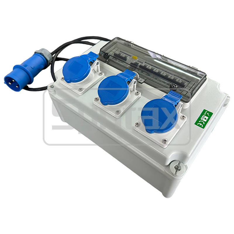 Jednofazowa skrzynka rozdzielcza 32 AMP montowana na ścianie do użytku zewnętrznego jest wykonana z materiału PC, posiada przedłużacz 3C4mm2 1,5m z wtyczką 3P 32A 220v, zabezpieczoną przez MCB+RCCB. Gniazda wyjściowe to gniazda montowane na panelu, proste, 3P 16A 220v IP44, które są zabezpieczone przez 3 szt. 2P 16A MCB. Wszystkie tablice dystrybucji zasilania są budowane na zamówienie.