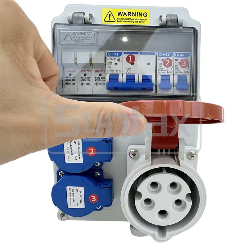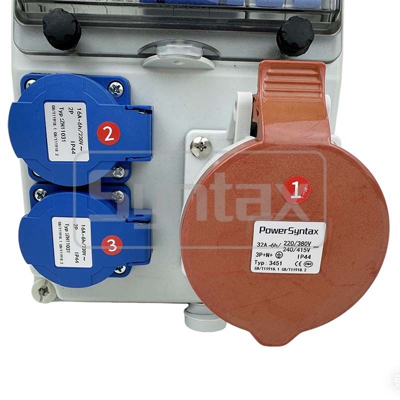 32 AMP trójfazowa dystrybucja na ścianie jest wykonana z materiału PC na ścianie, tam/z wtyczką wchodzącą z pudełka, bezpieczniki 3x32A do podłączenia kabli wchodzących.i 2 nr 16A/2P+E 220v IP44 gniazda SchukoWszystkie tablice dystrybucyjne są budowane na zamówienie.