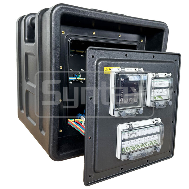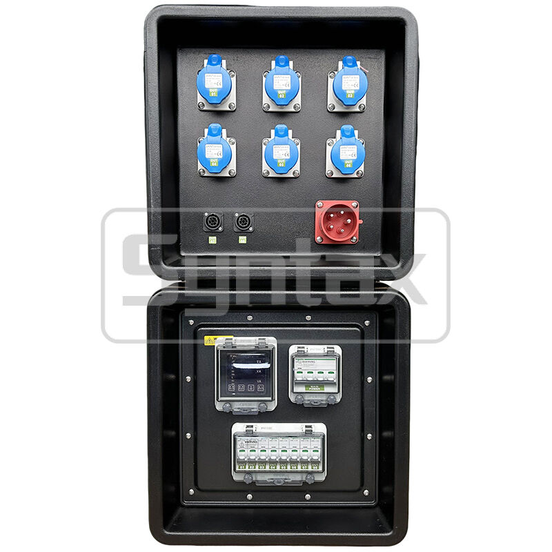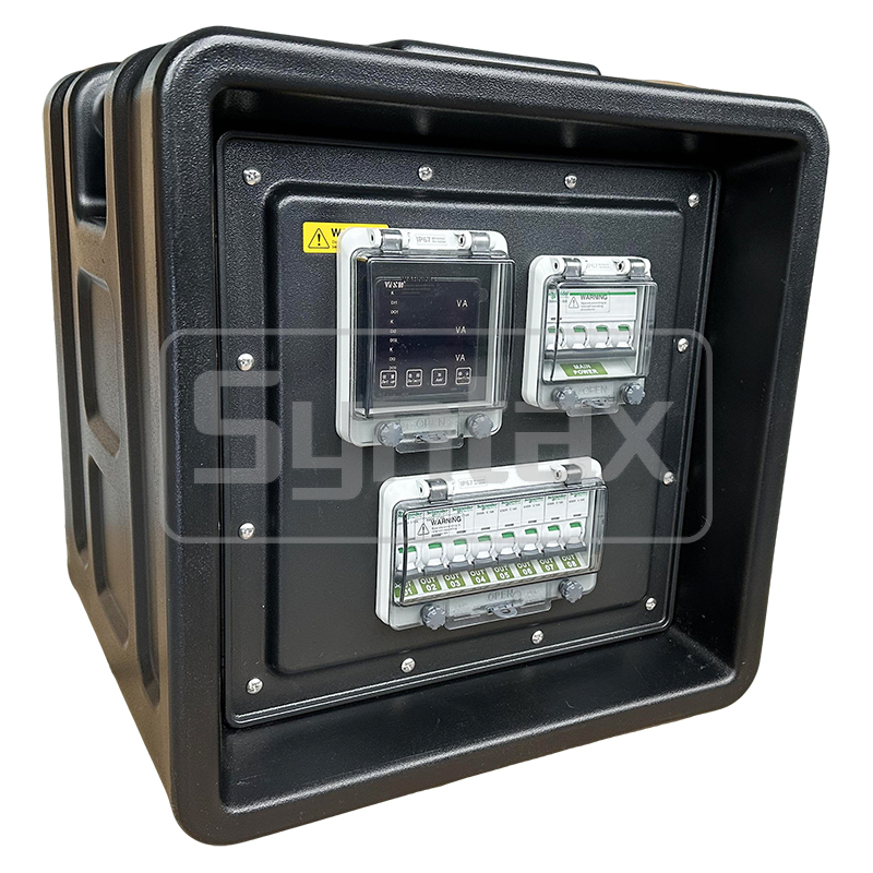 Ta trójfazowa tymczasowa tablica rozdzielcza została specjalnie zaprojektowana do tymczasowych zastosowań zasilania scenicznego. Wejście wejściowe 32AMP/5P jest chronione przez MCB 4P 32A i zawiera wielofunkcyjny miernik. Obwody wychodzące składają się z 6 gniazd 16A/3P 220 V i 2 gniazd 16A/2P+E 220 V True 1, każde zabezpieczone indywidualnymi wyłącznikami MCB 1P 16A. Konstrukcja PE o wodoodporności IP67 sprawia, że idealnie nadaje się na imprezy sportowe, zwłaszcza zawody pływackie. Niestandardowe skrzynki rozdzielcze zasilania można zbudować na zamówienie.