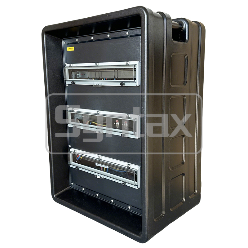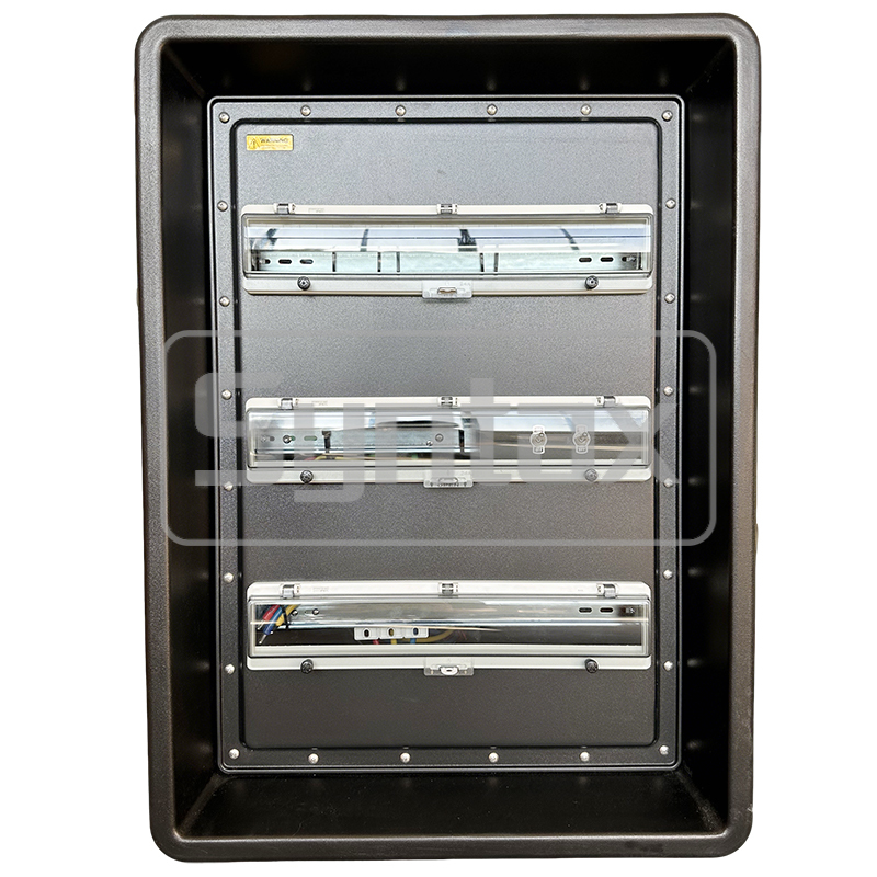 | Wyjścia 7-12 | 6×3P 32A 220V IP67 Panelowe Gniazda, zabezpieczone przez 6×1P+N 32A 30mA RCBO |